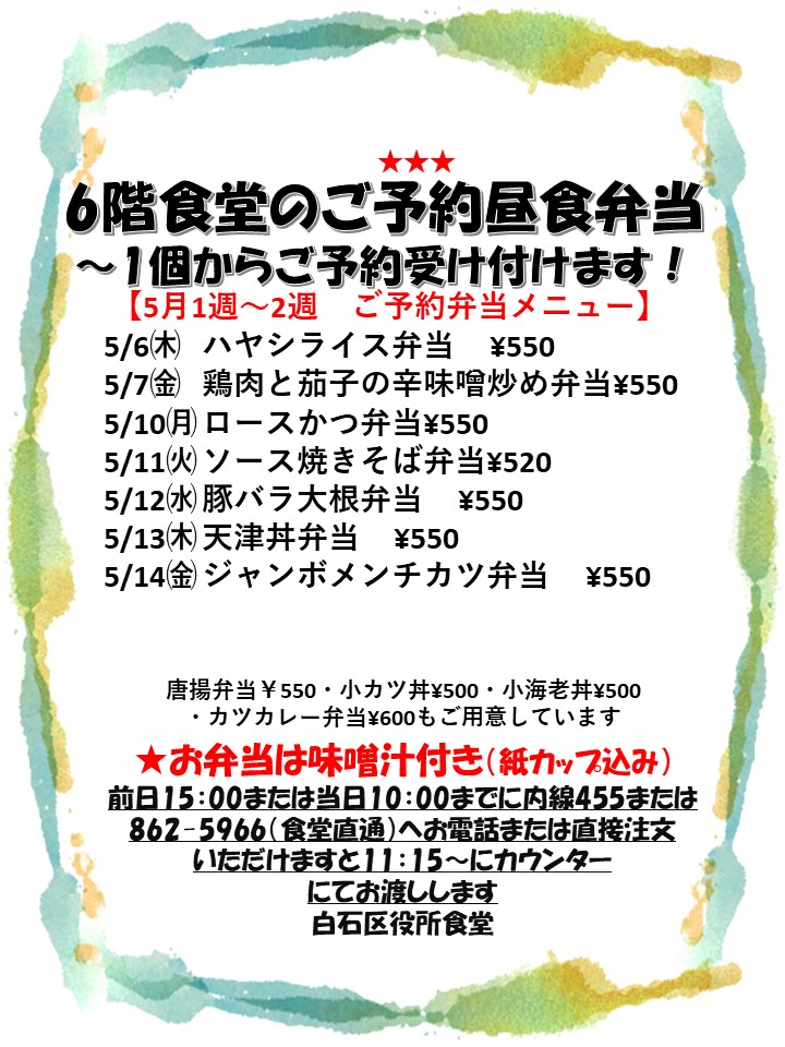 白石区役所食堂 5/14(金)店長おすすめ日替わりランチご紹介 テイクアウトお弁当もご予約受付中~
