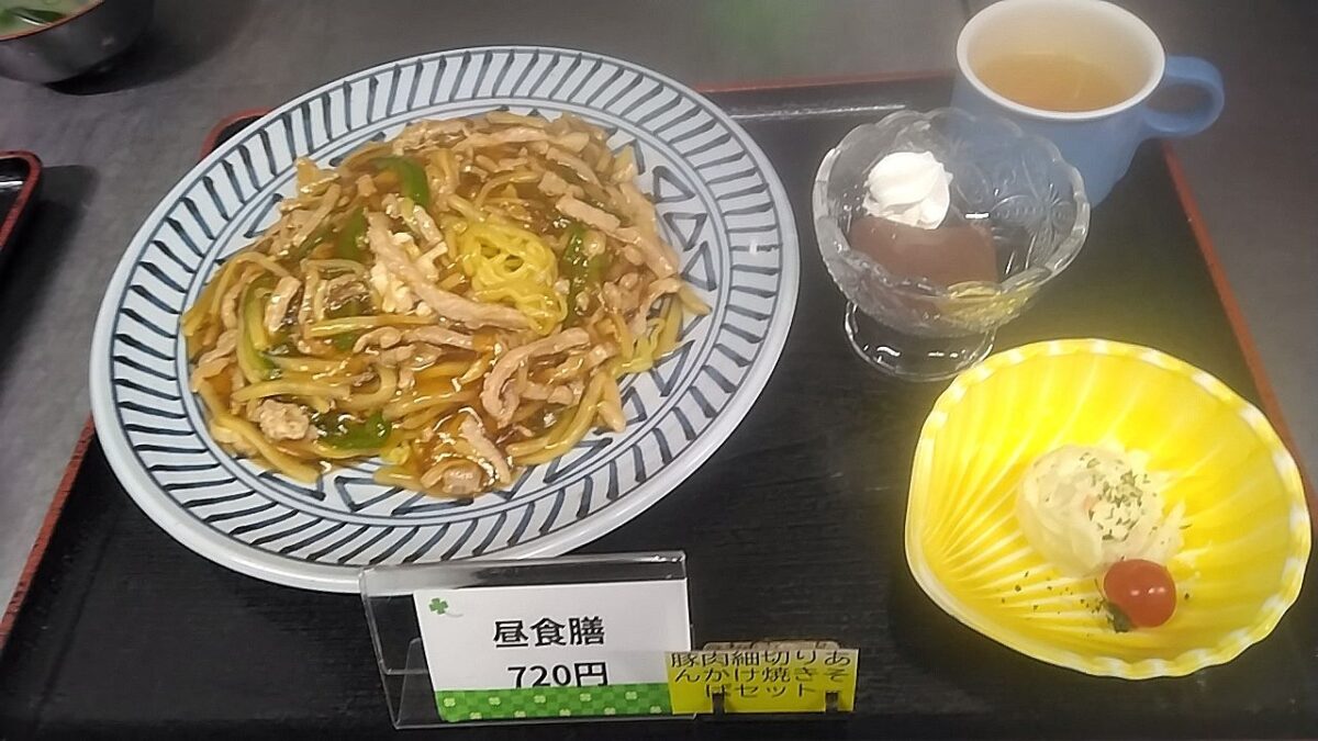 【昼食膳】豚肉細切りあんかけ焼きそば スープ。デザートセット 720円!