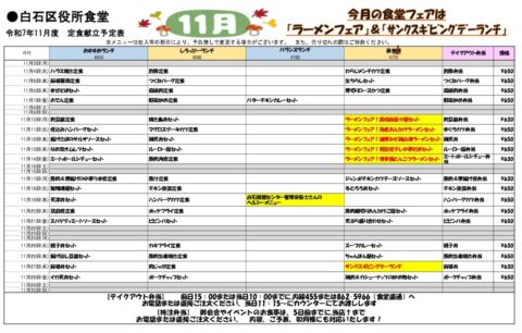 白石区役所食堂 10/28(火)本日の定食ご案内! 「なべ焼きうどん」ご提供開始しました♪ テイクアウト弁当ご予約もお待ちしております。
