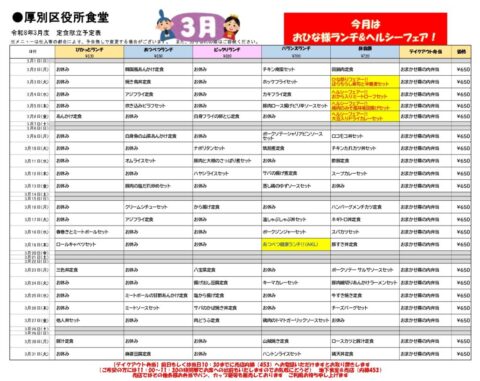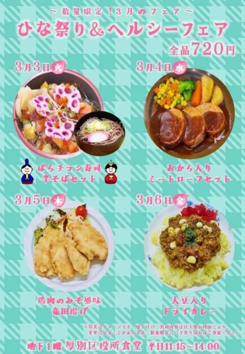厚別区役所食堂・売店 2/25(水)本日の定食ご案内♪ 3月の食堂フェア情報を掲載しました。併設売店の食堂店長手造りお弁当、切手印紙・事業所用プリペイドごみ袋もご利用お待ちしております。