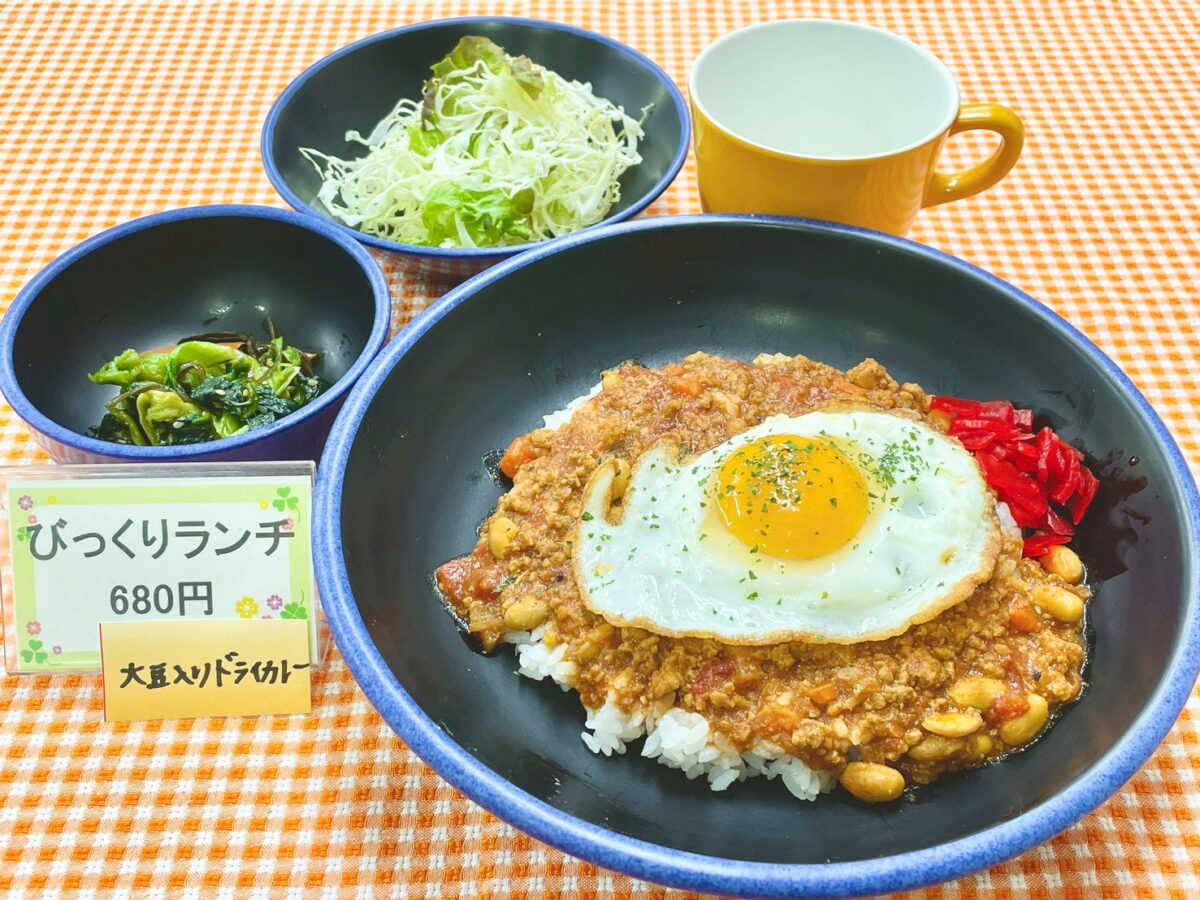 【びっくりランチ】目玉焼きのせ大豆入りドライカレーセット 680円!