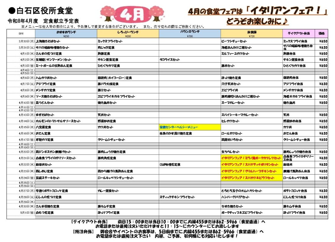 白石区役所食堂 3/25(水)本日の定食ご案内! テイクアウト弁当ご予約もお待ちしております。