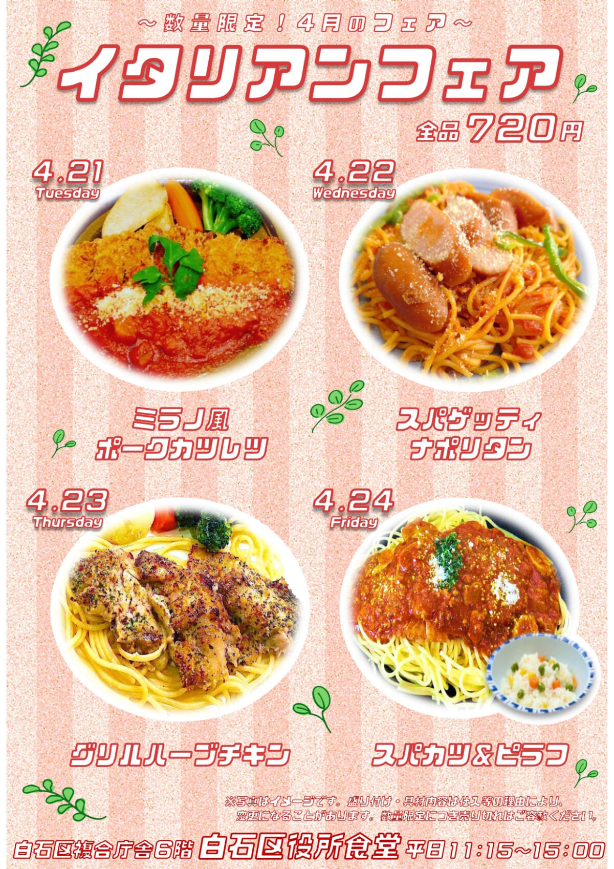 白石区役所食堂 4/16(木)本日の定食ご案内! 来週4/21~24開催 食堂イタリアンフェア情報掲載しました♪ テイクアウト弁当ご予約もお待ちしております。