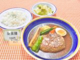【すずらん定食】 根菜バーグ 550円 地下食堂内の様子です。奥の大きな窓からは地下食堂の名前からは想像できないきれいな園庭を眺めることができます。 晴れた日にはお日様の...